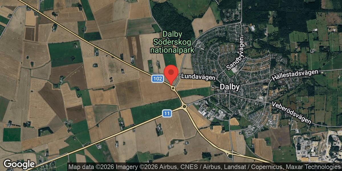 Hinder på vägbanan i cirkulationsplats Dalby Västra vid Väg 102 i Lund orsakar faror och stor påverkan i båda riktningarna. Åtgärder beräknas vara klara klockan 10:00 den 12 mars 2026.