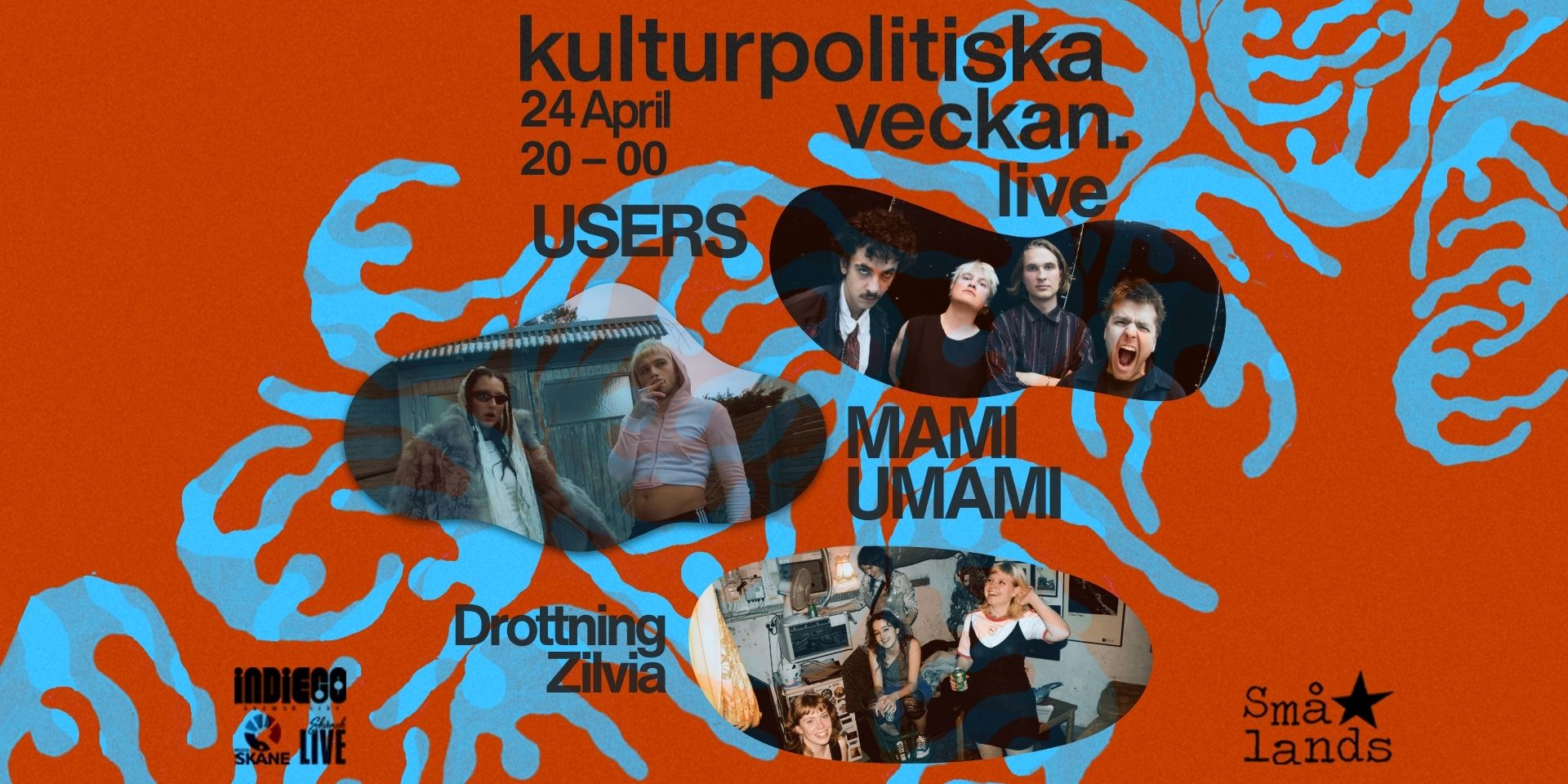 Kvällen startar med Göteborg/Malmö-baserade indiebandet Drottning Zilvia, som bjuder på allt från shoegaze till folk, psykedelisk rock och klassisk pop. Därefter fortsätter vi med den energifyllda duon MAMI UMAMI som erbjuder häftig hip-hop, rebellisk punk och breakbeats, följt av Danmarks explosiva post-punk-fenomen USERS. USERS levererar en oförglömlig, dansant och samhällsdriven moshpit. Direkt och omöjligt att ignorera.
